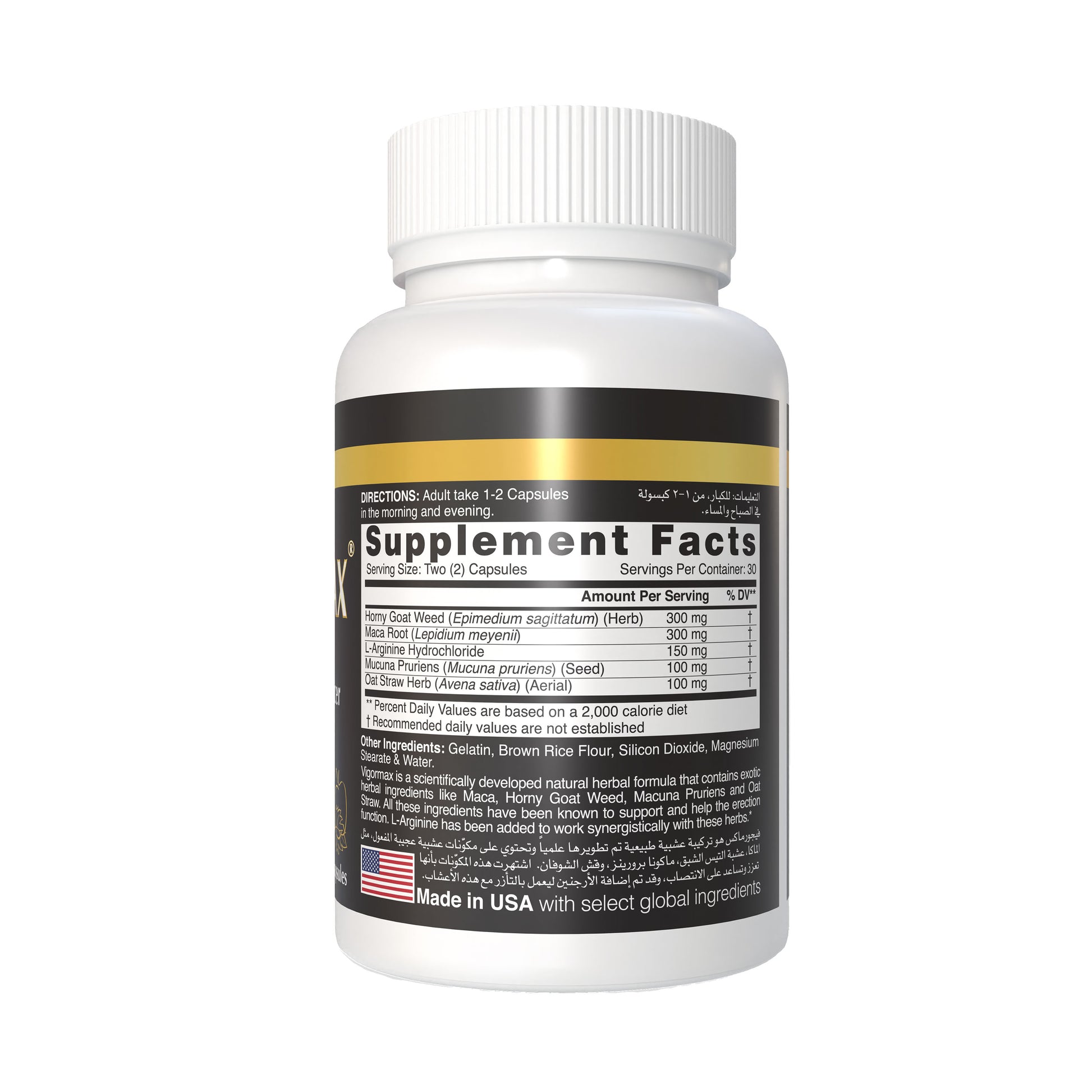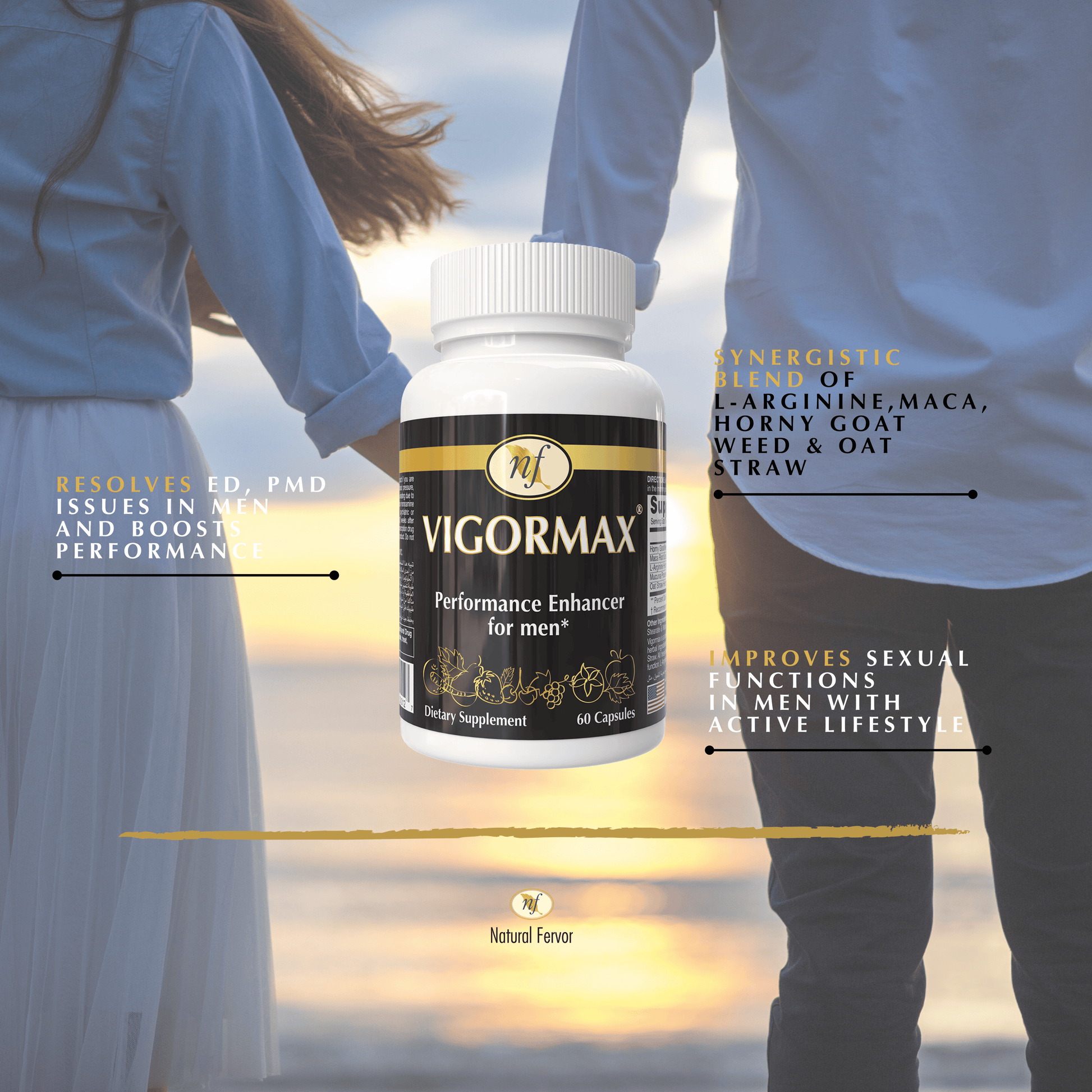 Vigormax contains natural aphrodisiacs that offer an ideal approach towards positive sexual health and high sexual pleasure. Vigormax containing Maca, L - Arginine, Mucuna Prurien, Oat Straw which works synergistically to boost libido (desire), improve erectile function, and increase testosterone levels from an androgen-like influence on the testes, prostate and sexual muscles.