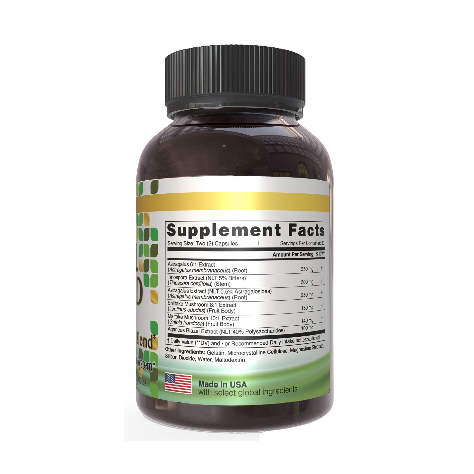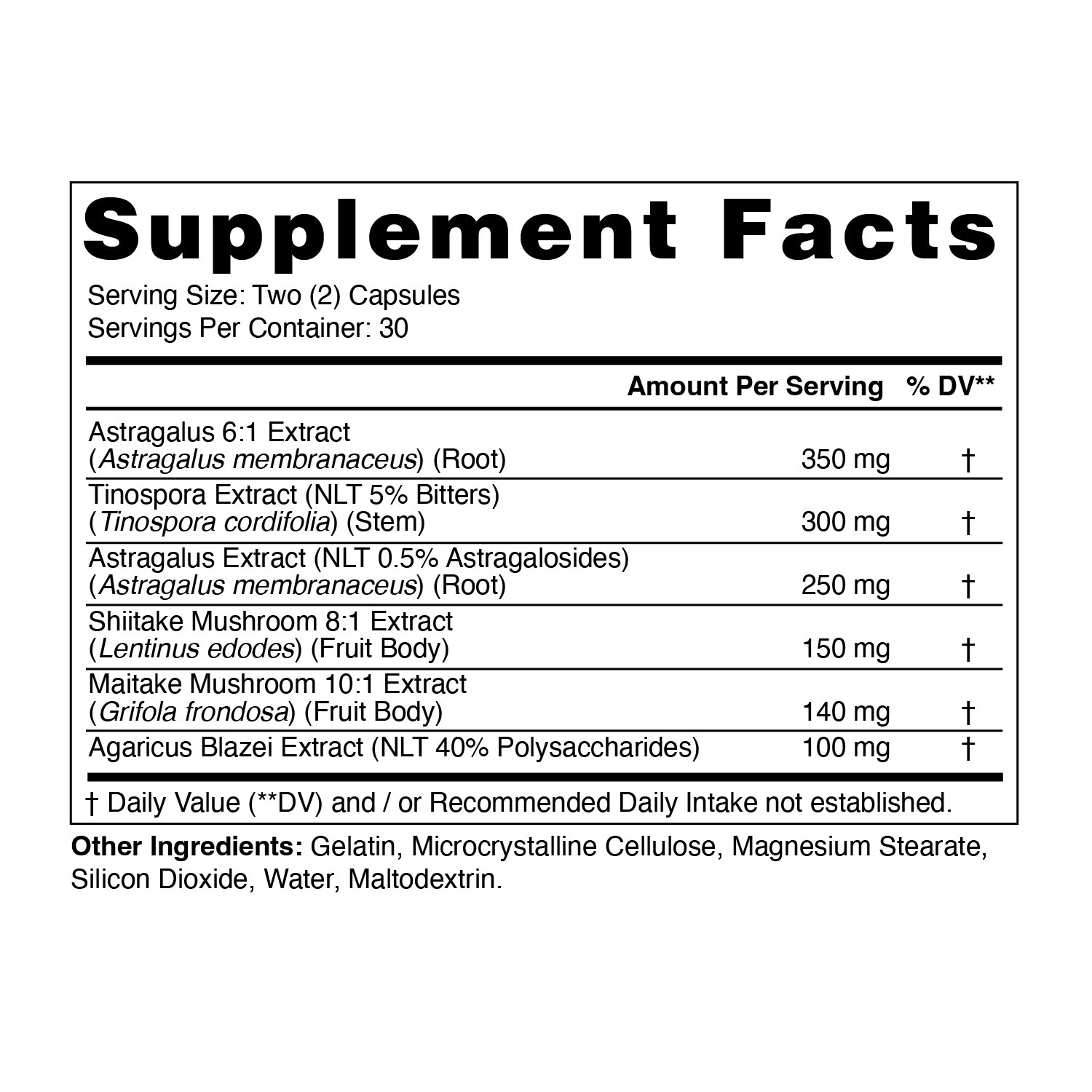 combination of Astragalus, Tinospora, Shiitake Mushroom, Maitake Mushroom and Agaricus Blazei Extract designed specifically to support healthy immune system. Synergistic effect of this powerful combination helps to enhance immunity and provide stronger shield against antigens. (virus and bacteria).
